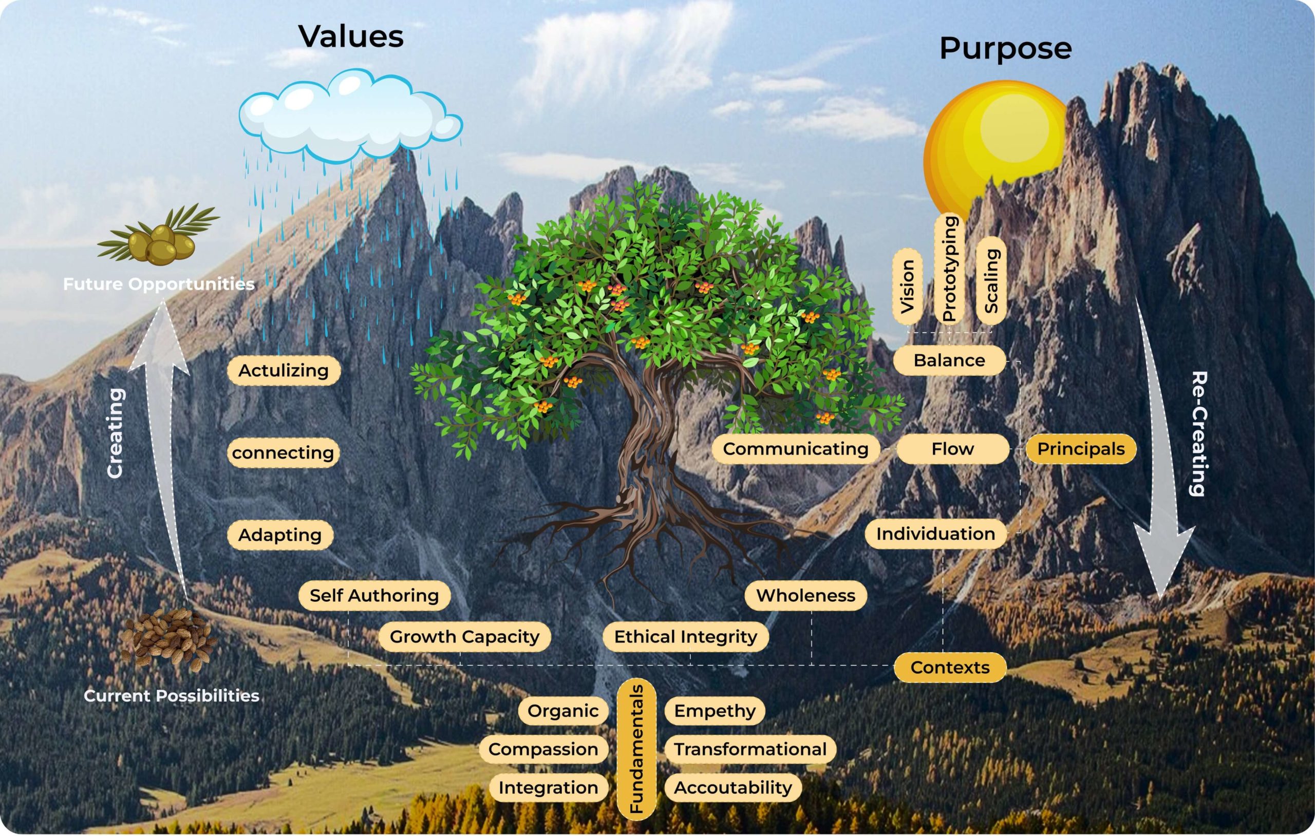 From roots to fruits. Like the olive tree, the journey moves from current possibilities to future opportunities, honouring the whole person through an organic framework of Individuation, Flow, Balance, and Crystallisation.
